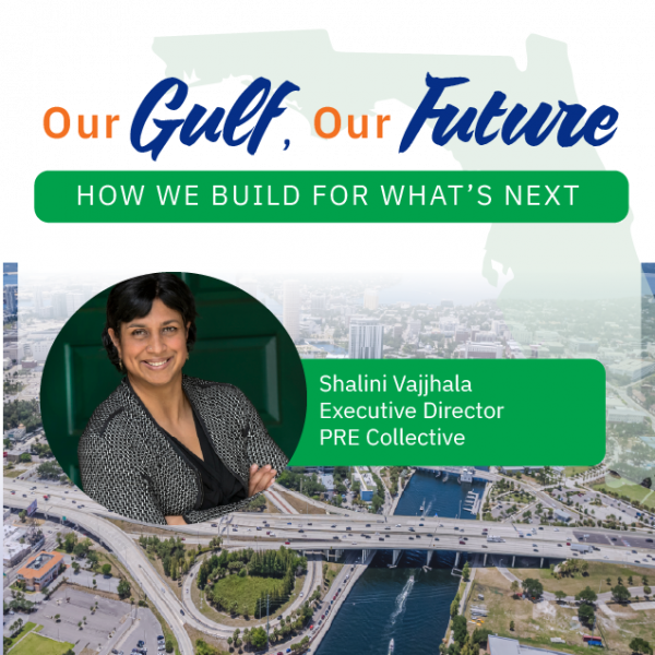 Join Shalini Vajjhala, a nationally recognized infrastructure and climate resilience expert, for a practical talk about planning and building for the long term, not just patching problems with short-term band-aids. Drawing on case studies, Vajjhala will offer simple ways we can all get involved and work together on everyday choices: where we build, how we handle flooding and heat, and how we help those most in need. The future of the Gulf is in our hands. Let’s build it together.