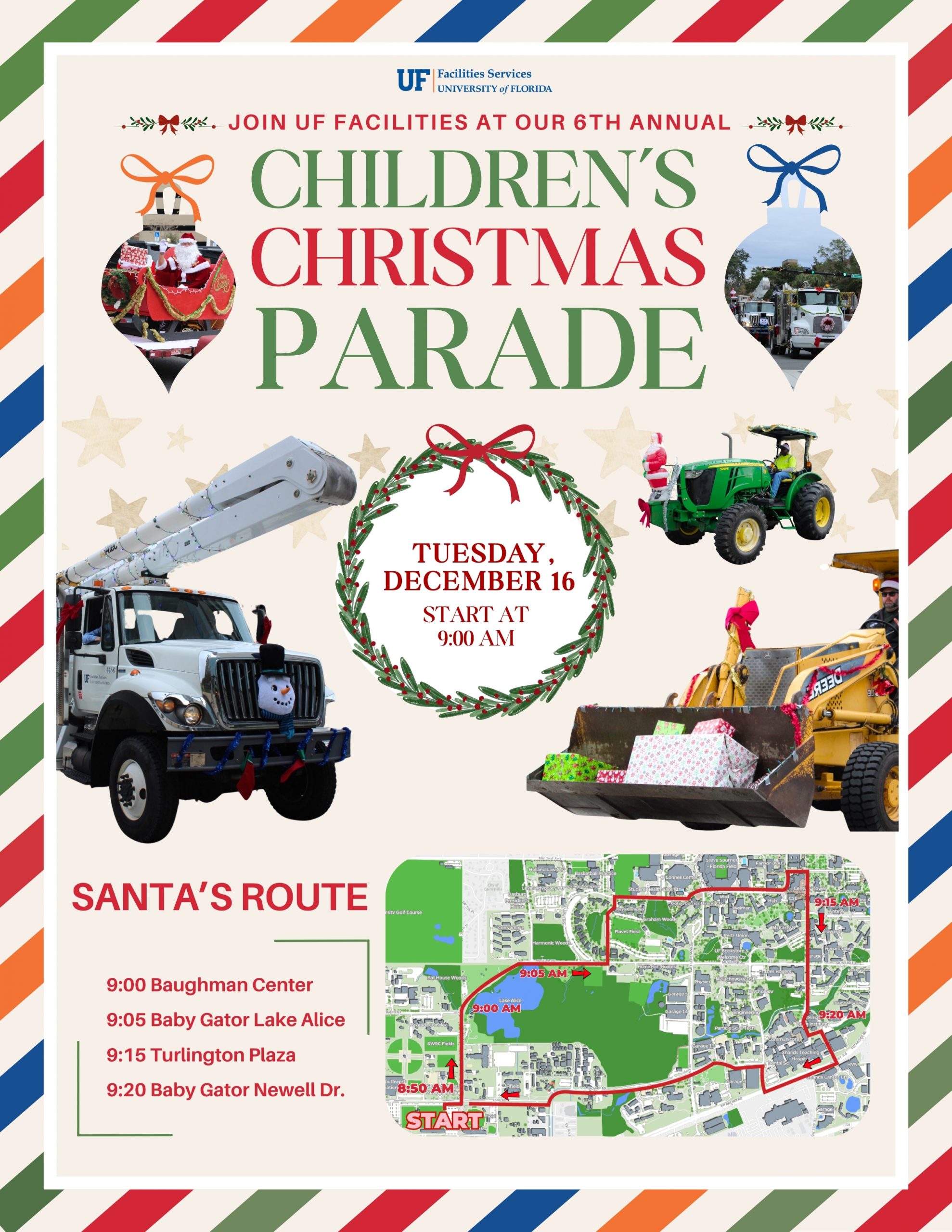 Parade map and details can be found here: https://www.facilitiesservices.ufl.edu/news/news/university-of-florida-facilities-services-6th-annual-childrens-christmas-parade/